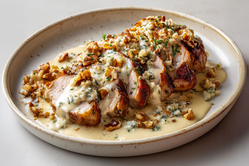 Filet mignon de porc tranché, nappé d’une sauce au roquefort et aux noix, onctueuse et fondante, servi dans une assiette rustique.