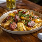 - Préparer les saucisses : Pendant ce temps, coupez les saucisses en rondelles épaisses et faites-les revenir dans une autre poêle jusqu’à ce qu’elles soient dorées.